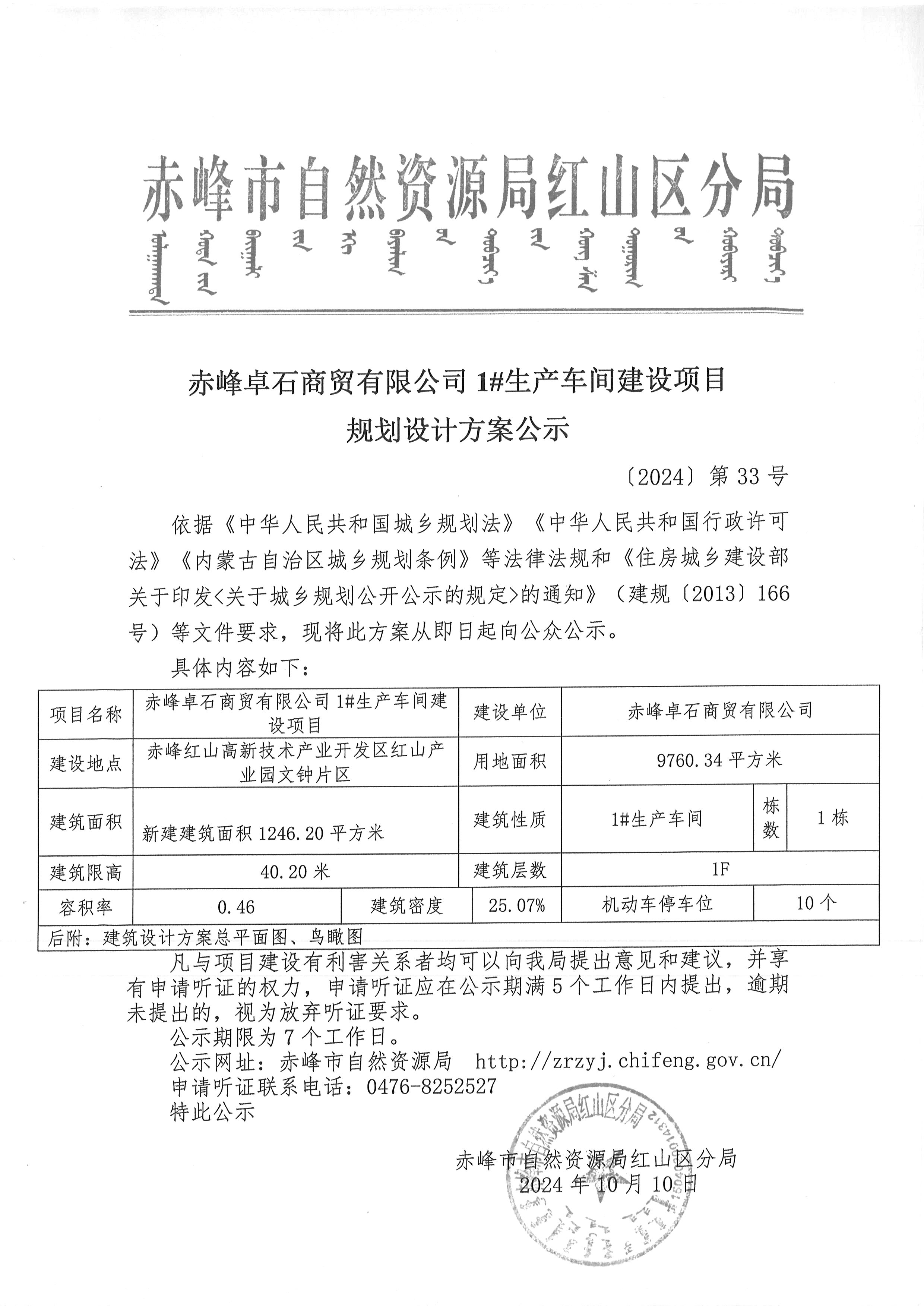 赤峰卓石商贸有限公司1#生产车间建设项目规划设计方案公示