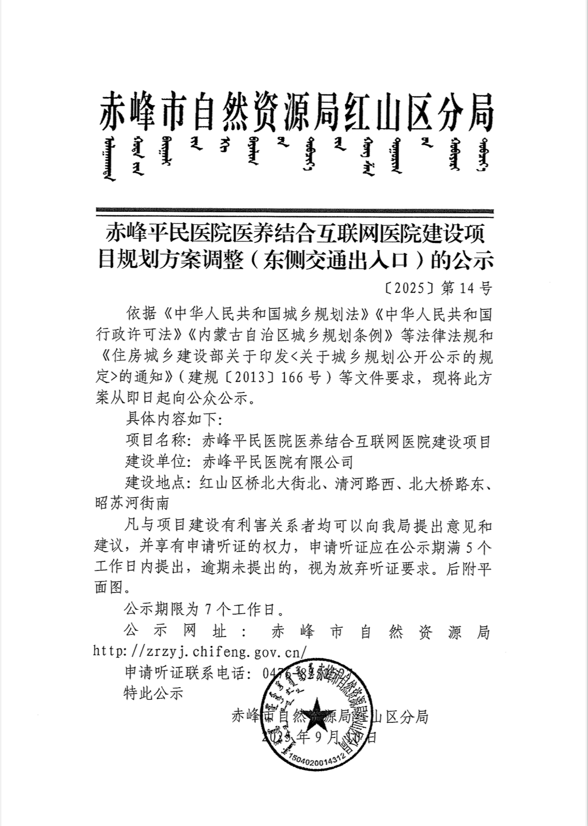 赤峰平民医院医养结合互联网医院建设项目规划方案调整(东侧交通出入口)的公示
