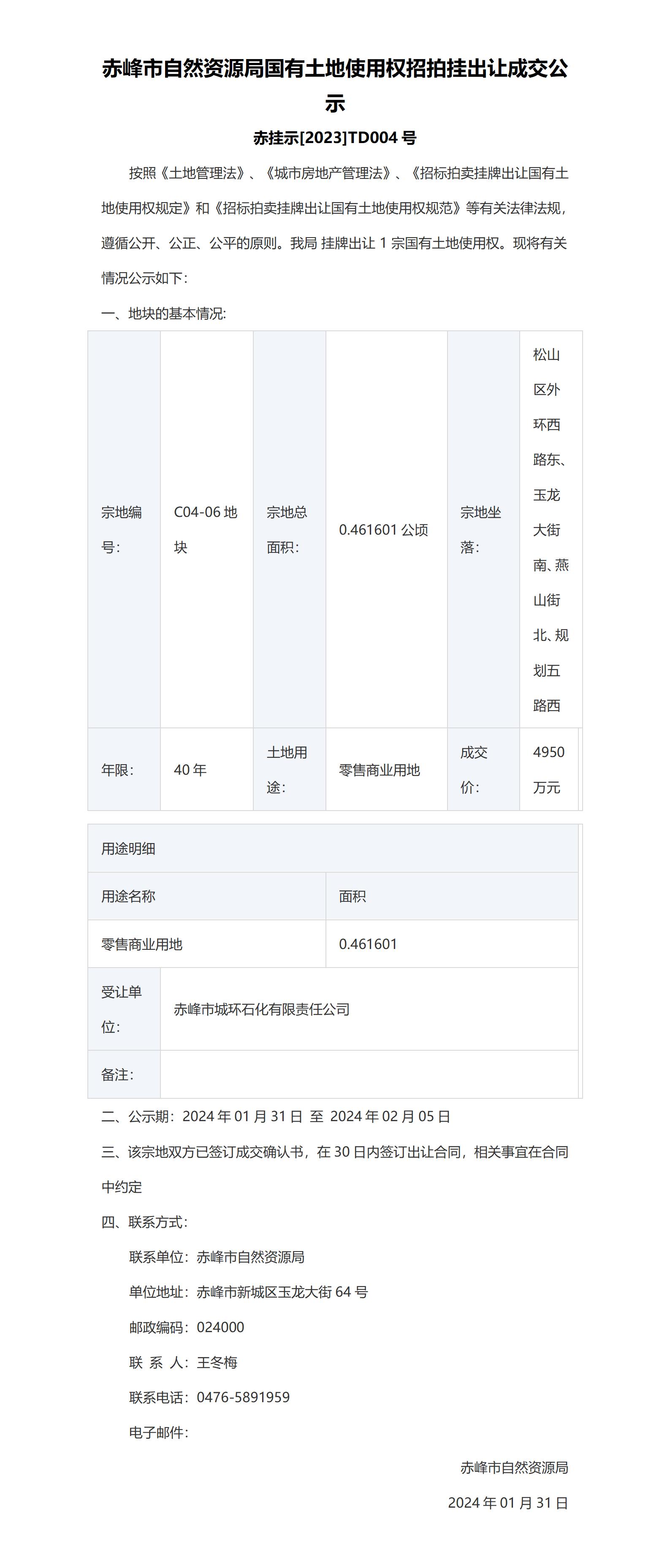赤峰市自然资源局国有土地使用权招拍挂出让成交公示